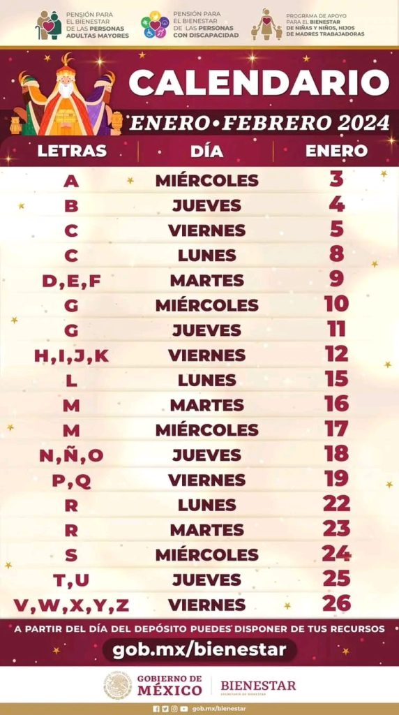 El pago de la pensión comenzará a partir del 03 de enero a los adultos mayores cuyo primer apellido comienza con A y hasta finalizar con las letras V, W, X, Y, Z, el viernes 26 de enero.