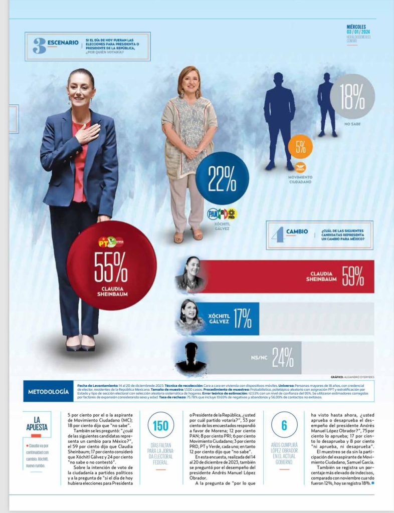 Ciudad de México; 3 de enero de 2024 – La precandidata de Morena-PT-PVEM a la Presidencia de la República, Claudia Sheinbaum, ha iniciado el año 2024 a la cabeza de las preferencias electorales, según la encuesta realizada por Covarrubias y Asociados para Heraldo Media Group.