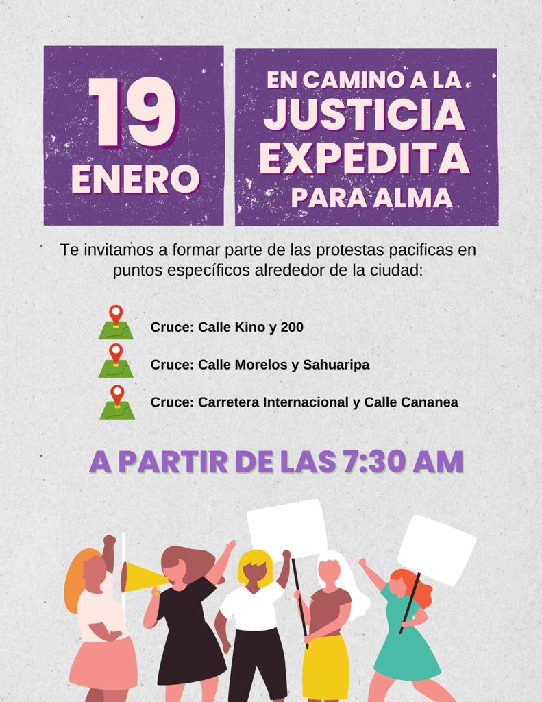 Ciudad Obregón, Sonora a 17 de Enero de 2024.- Para recordar y exigir justicia para Alma Lourdes, familiares, amigos y sociedad en general, se reunirán el próximo 19 de enero en diferentes puntos de Ciudad Obregón para llevar a cabo de manera simultánea tres manifestaciones a manera de protesta.