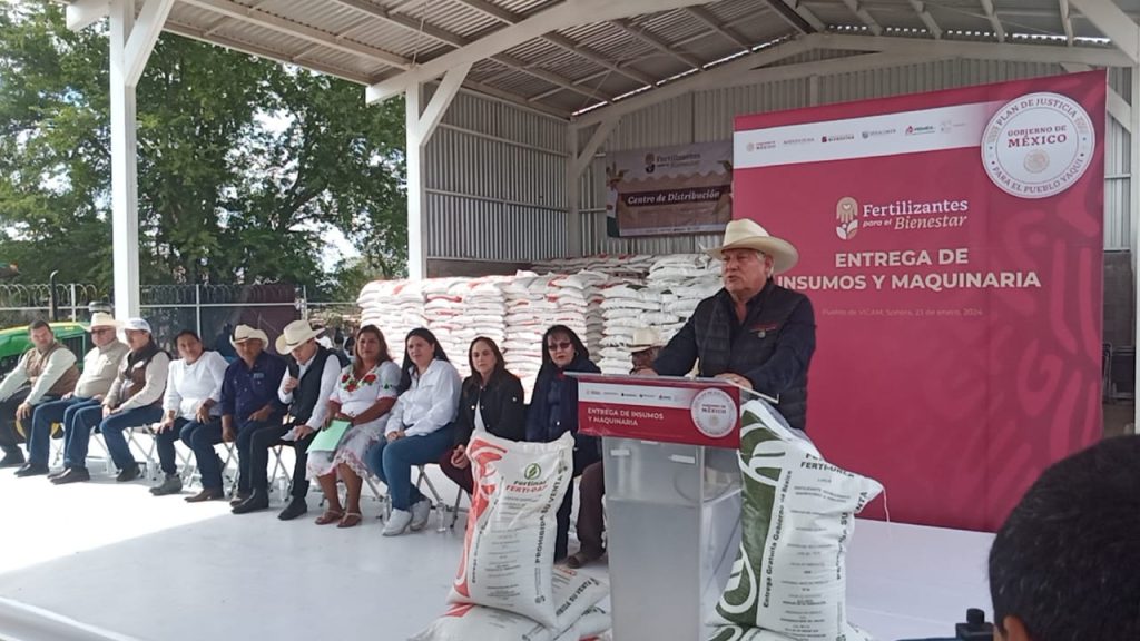 El titular de la dependencia federal, participó en la entrega de insumos y maquinaria a productores agrícolas de los ocho Pueblos Yaquis, a quienes les pidió hacer buen uso de los apoyos y no venderlos a terceros.