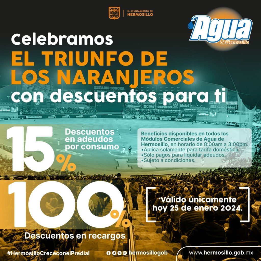 Hermosillo, Sonora a 25 de Enero de 2024.- Debido al triunfo del equipo de beisbol “Naranjeros de Hermosillo” una serie de descuentos y promociones se desataron en la capital sonorense, que van desde impuestos gubernamentales hasta vehículos último modelo gratis.