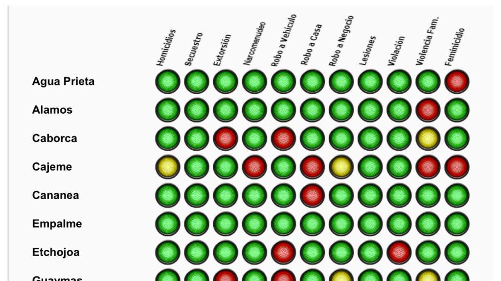 Ciudad Obregón, Sonora a 27 de Enero de 2024.- De los once delitos que mensualmente analiza y contabiliza el semáforo delictivo, en cuatro de ellos Cajeme se encuentra en focos rojos, en cinco en verde y en dos en amarillo.