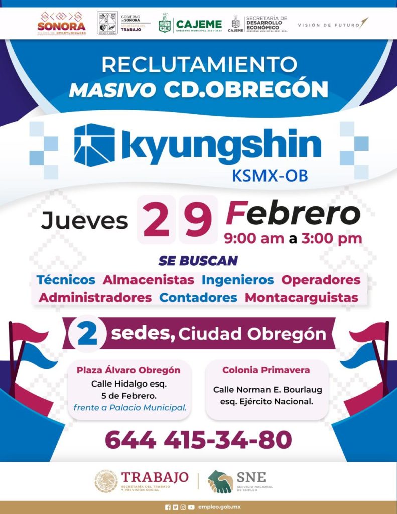 Ciudad Obregón, Sonora a 15 de Febrero de 2024.- El próximo 29 de febrero la Secretaría de Economía Municipal y el Servicio Nacional del Empleo, pondrán en marcha una jornada de reclutamiento con el objetivo de contratar al personal que entrará a laborar en la empresa coreana Kyungshin.