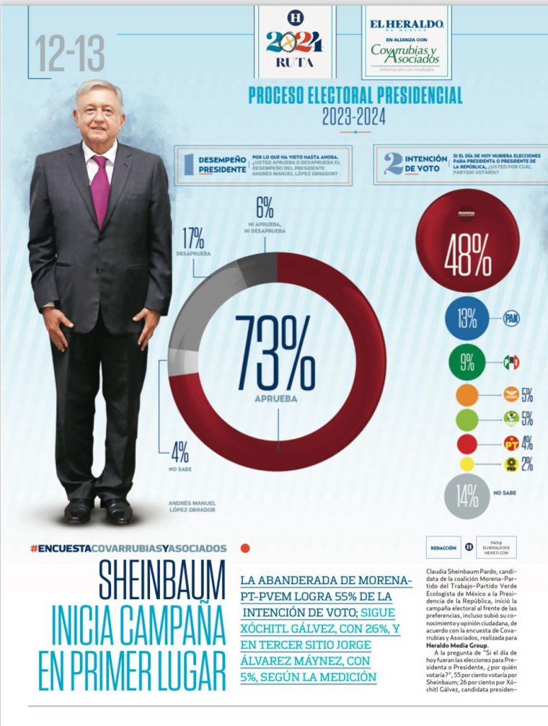 De acuerdo con la encuesta, si las elecciones fueran hoy, un 55% de los encuestados votaría por Sheinbaum, mientras que Xóchitl Gálvez, candidata presidencial de la coalición Partido Acción Nacional-Partido Revolucionario Institucional-Partido de la Revolución Democrática, obtendría un 26% de los votos. Por su parte, Jorge Álvarez Máynez, abanderado de Movimiento Ciudadano, se sitúa en tercer lugar con un 5% de intención de voto.