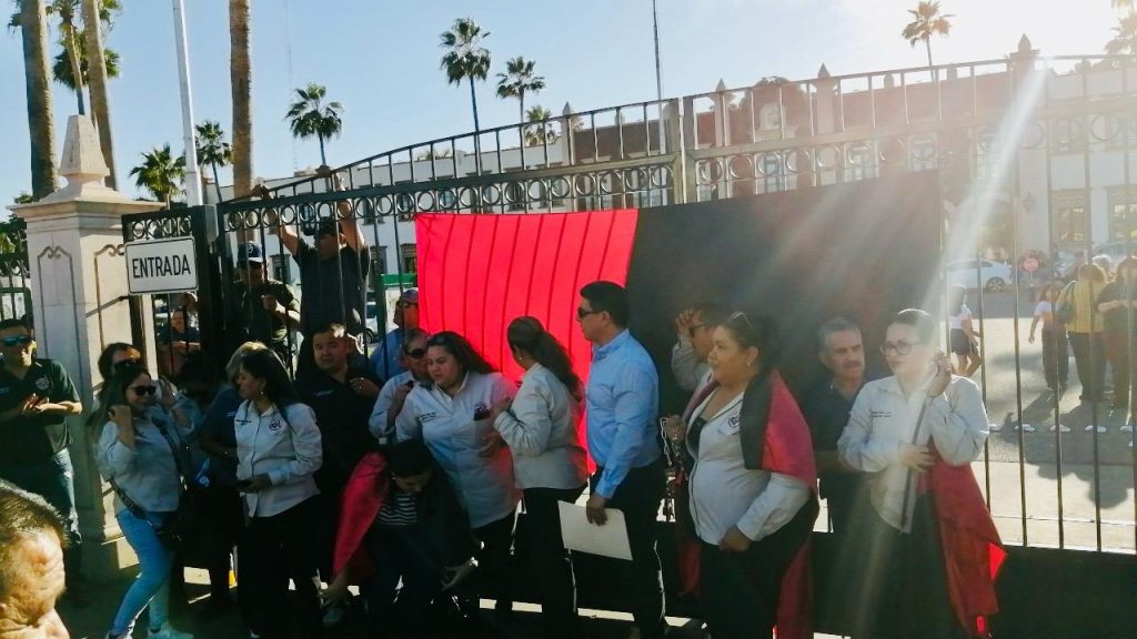 Hermosillo, Sonora a 15 de abril del 2024. Los integrantes del Sindicato de Trabajadores y Empleados de la Universidad de Sonora (STEUS), colocaron en punto de las 5 de la tarde las banderas rojinegras de huelga en la entrada principal a Rectoría.