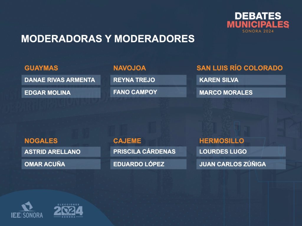 Para el debate de Nogales, el Consejo avaló como moderadores a Astrid Arellano y Omar Acuña; en el caso de Cajeme a Priscila Cárdenas y Eduardo López y para la alcaldía de Hermosillo a Lourdes Lugo y Juan Carlos Zuñiga.