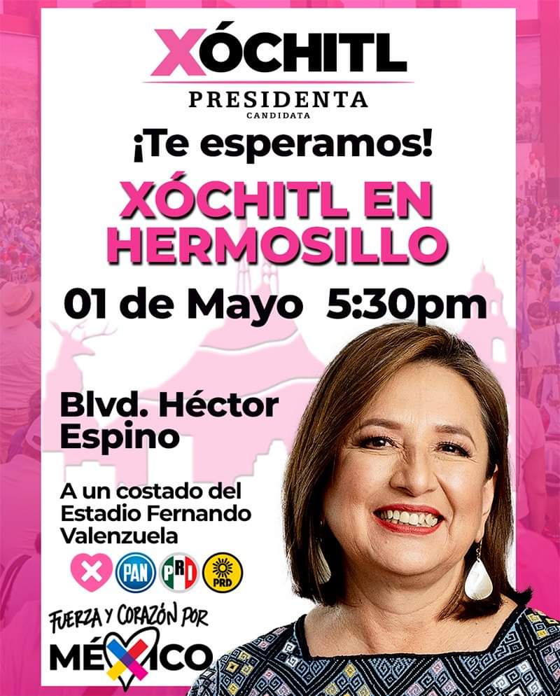 La candidata tendrá un evento masivo el próximo 01 de mayo en Hermosillo, en el estacionamiento del Estadio Fernando Valenzuela a partir de las 5:30 de la tarde.