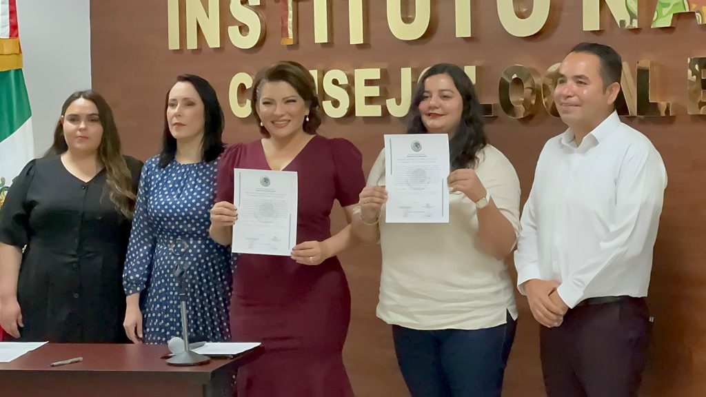 De manos de la vocal presidente de la junta local del INE en el Estado, Verónica Sandoval Castañeda, Heriberto Aguilar y Lorenia Valles obtuvieron el documento que los acredita como los ganadores de la elección a senadores por Sonora.