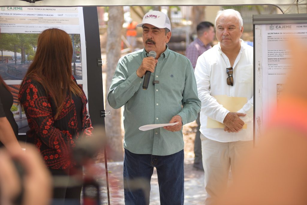 El proyecto contempla la contrucción de un área deportiva, explanada cultural y de un centro comunitario, además de contar con cancha de fútbol, básquetbol, voleibol, área de mesas, área de nadadores y jardines, y el monumento al maestro.