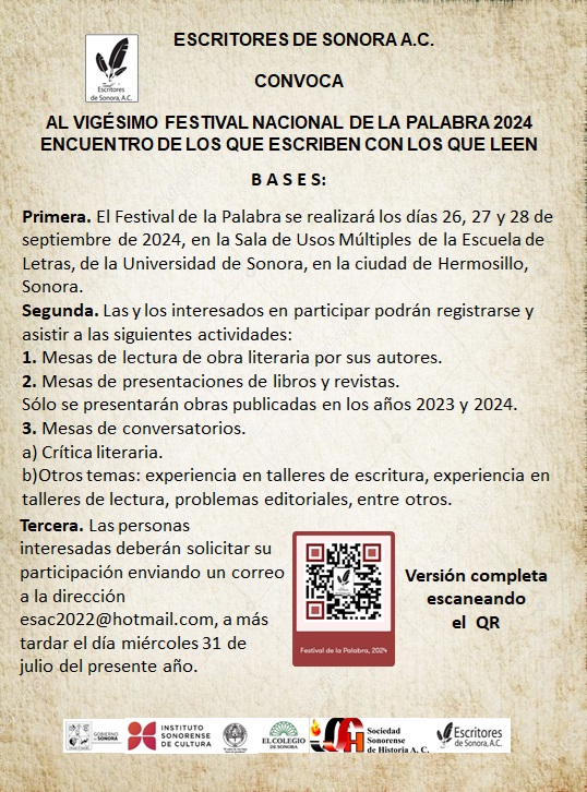 Hermosillo, Sonora a 19 de julio del 2024. La Asociación de Escritores de Sonora A.C. convoca a la sociedad en general a participar en el XX Festival Nacional de la Palabra 2024 “Encuentro de los que escriben con los que leen” a realizarse en la escuela de Letras de la Universidad de Sonora del 26 al 28 de agosto.