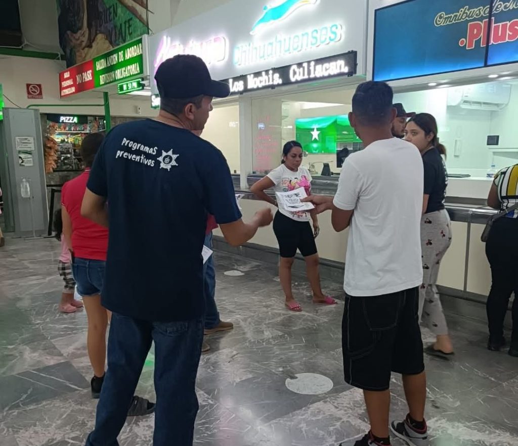 Por su parte, la Dirección de Programas en Prevención del Delito trabaja en la repartición de volantes informativos en áreas como la Central de Autobuses, Mercajeme y el Mercadito Unión, llevando a las y los ciudadanos medidas de seguridad para prevenir robos a comercio y casa habitación.
