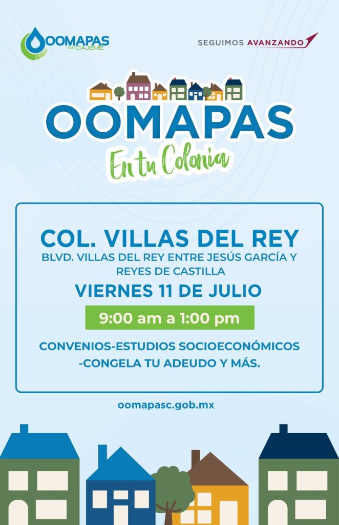 Cajeme, Sonora, 11 de julio.— El Organismo Operador Municipal de Agua Potable, Alcantarillado y Saneamiento (OOMAPAS) llegará este viernes 11 de julio a la colonia Villas del Rey con su módulo móvil de atención “OOMAPAS en tu colonia”. La atención se ofrecerá de 9:00 a.m. a 1:00 p.m. en el bulevar Villas del Rey, entre Jesús García y Reyes de Castilla.