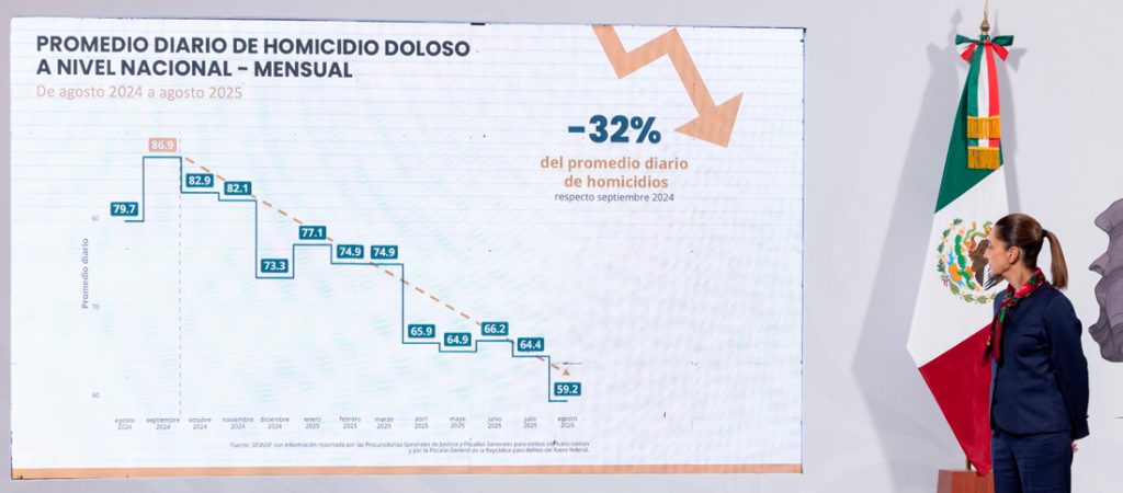 Ciudad de México, 9 de septiembre de 2025.– El Gabinete de Seguridad del Gobierno de México informó que los homicidios dolosos en el país registraron una reducción de 32 por ciento al cierre de agosto, en comparación con septiembre de 2024.
