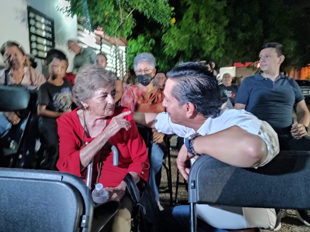 Desde la calle Nueve, en la banqueta de la señora Lucía Lerma, Figueroa destacó los avances que se tienen en Sonora y en el país en materia de bienestar, como la pensión para mujeres mayores de 60 años y la beca Rita Cetina.