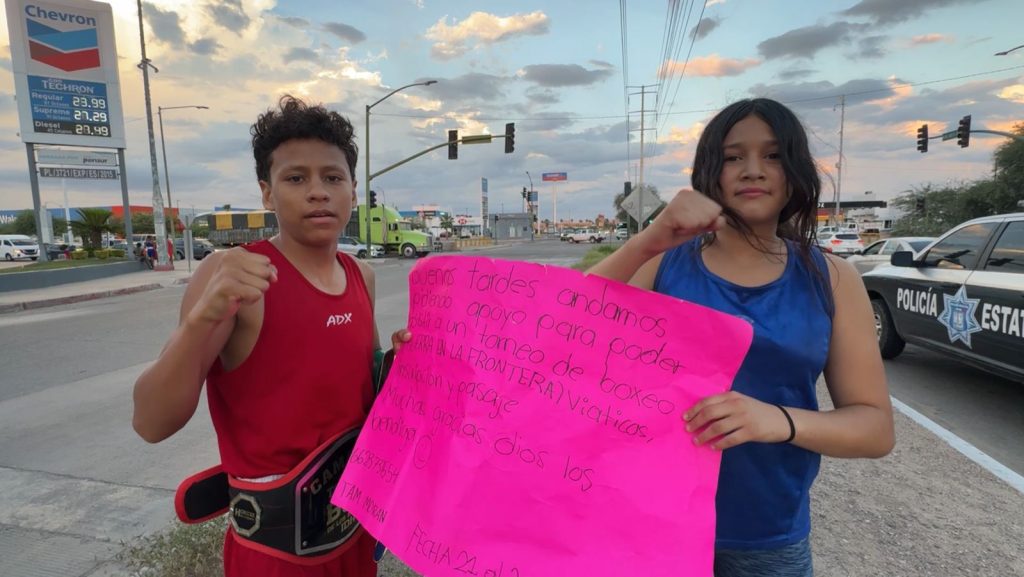 Hermosillo, Sonora; 27 de septiembre de 2025.- En los semáforos de distintos cruceros de Hermosillo, un par de adolescentes aprovechan cada alto para mostrar la pasión que los mueve: el boxeo. Con guantes puestos, lanzan puños al aire practicando “sombras”, ese ejercicio clásico del pugilismo que simula un combate imaginario. Pero la pelea real que enfrentan no está en el ring, sino en las calles: conseguir el dinero suficiente para cumplir un sueño.