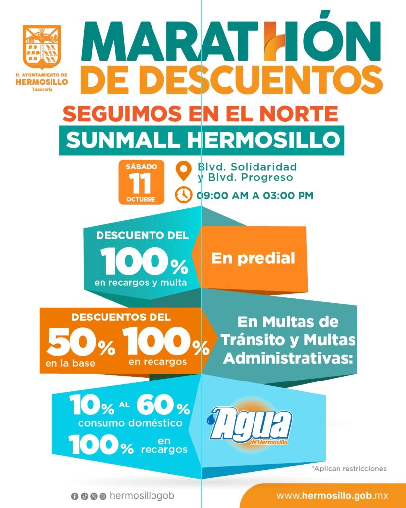 Hermosillo, Sonora; 8 de octubre de 2025.- El Gobierno Municipal de Hermosillo llevará a cabo un nuevo “Maratón de Descuentos” el próximo sábado 11 de octubre en la plaza comercial Sun Mall, ubicada en Progreso y Solidaridad, de 9:00 a 15:00 horas.