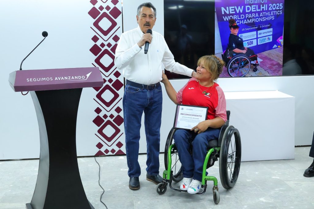“El honorable Ayuntamiento de Cajeme se enorgullece en otorgarle el presente reconocimiento a Leticia Ochoa Delgado, por su destacada participación en el Campeonato Mundial de Para Atletismo en Nueva Delhi, donde obtuvo el cuarto lugar mundial en lanzamiento de disco F52. Su dedicación y constancia la convierten en un orgullo”, expresó Lamarque al entregar la distinción.