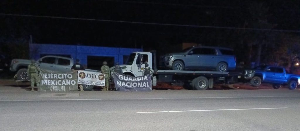 Hermosillo, Sonora; 11 de octubre de 2025.- Un total de cuatro camionetas de lujo con reporte de robo en Estados Unidos fueron aseguradas por agentes de la Guardia Nacional en las inmediaciones del municipio de Altar, Sonora. Se presume que las unidades eran utilizadas por el crimen organizado.