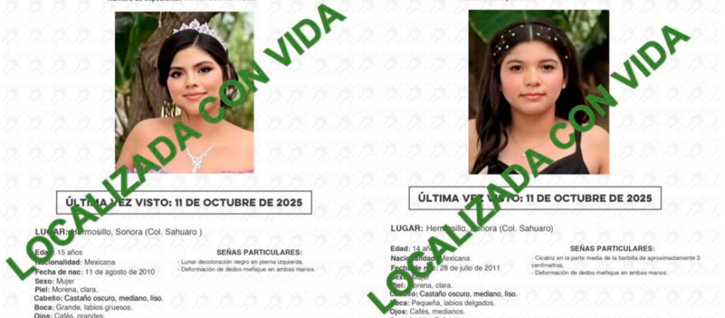 Hermosillo, Sonora, 13 de octubre de 2025.– Como resultado de las acciones inmediatas de búsqueda emprendidas por la Agencia Ministerial de Investigación Criminal (AMIC) y el trabajo coordinado con la Unidad Especializada en Personas Desaparecidas, fueron localizadas sanas y a salvo las hermanas Damaris Paola “N”, de 15 años, y Génesis Alejandra “N”, de 14 años, quienes contaban con denuncia interpuesta el mismo día de su localización.