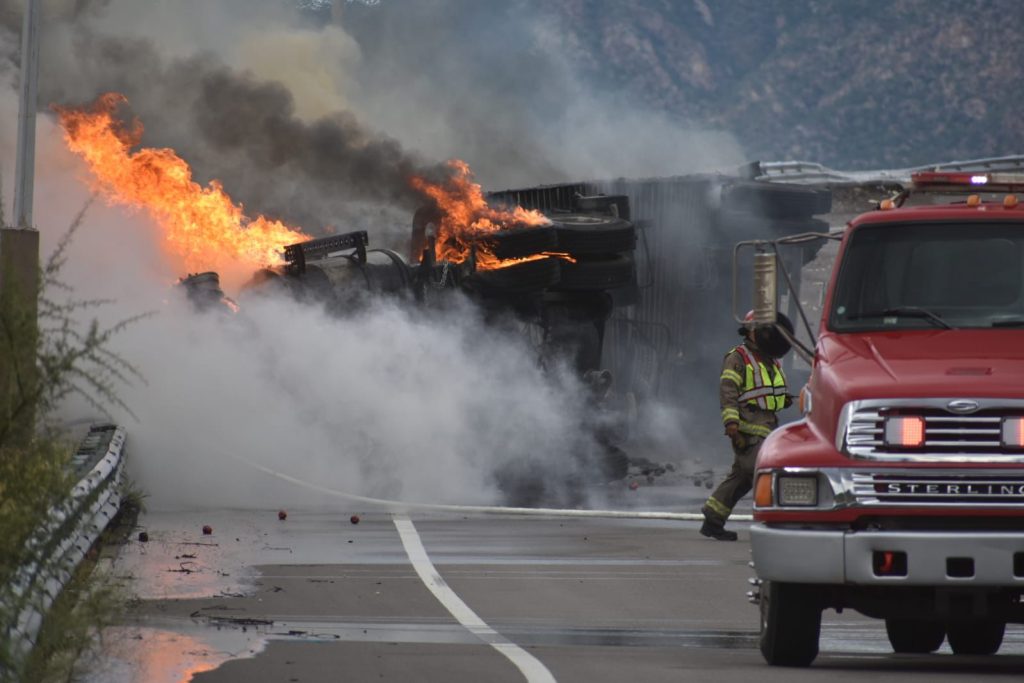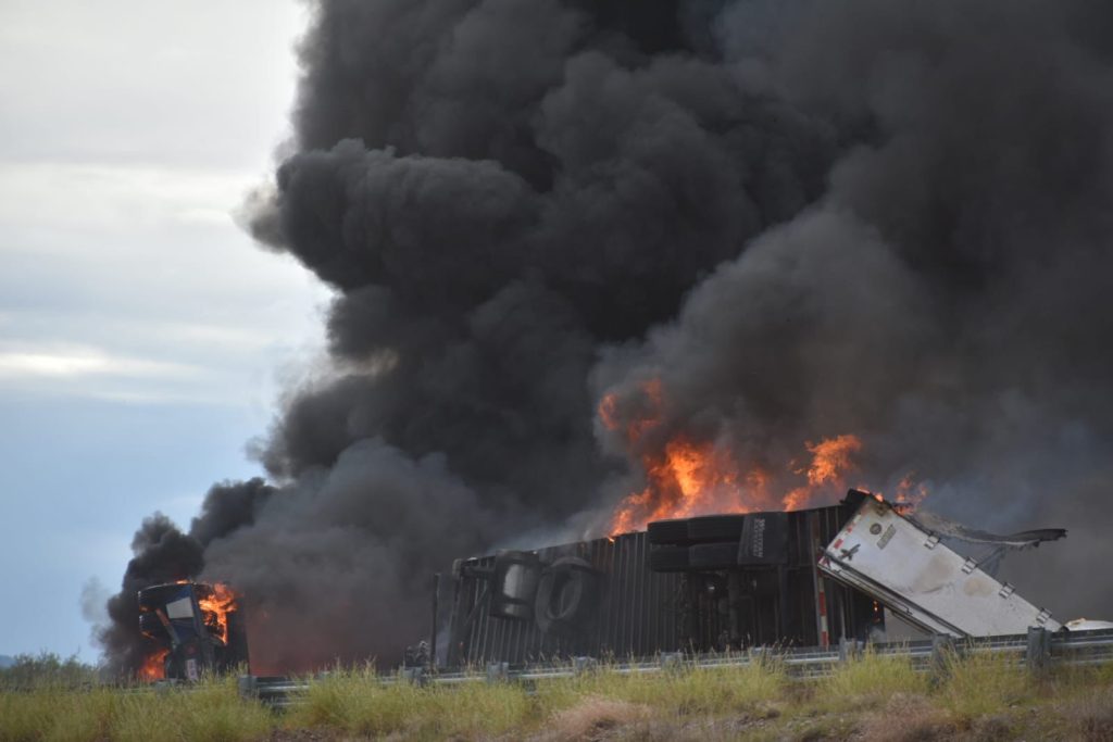 Hermosillo, Sonora. – Un tráiler se incendió en llamas al volcarse cuando trataba de incorporarse a la carretera internacional desde el libramiento de Hermosillo.