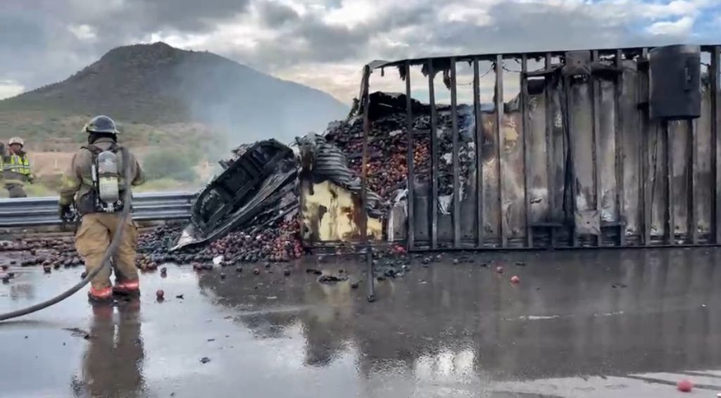 El percance ocurrió en el entronque del libramiento de Hermosillo y la Carretera Internacional, donde la unidad de carga, que transportaba manzanas, ardió en llamas durante la tarde de este domingo.