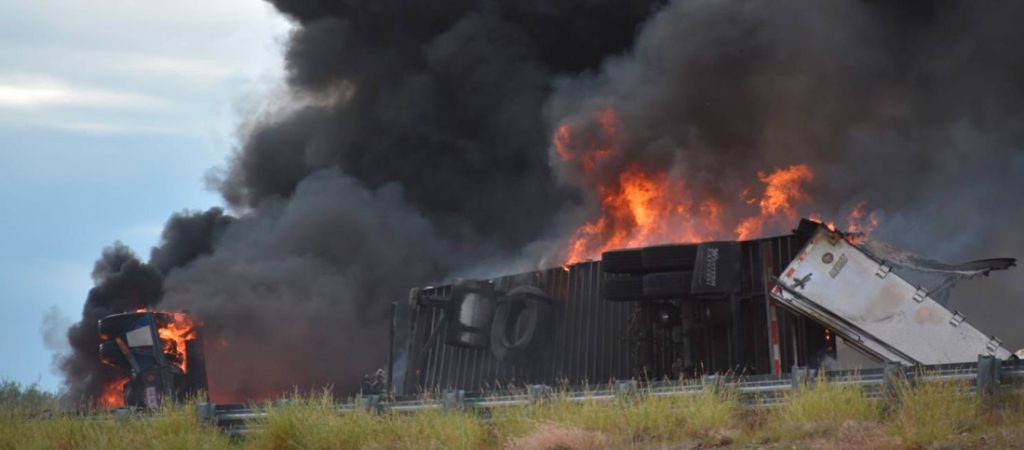 Hermosillo, Sonora. – Un tráiler se incendió en llamas al volcarse cuando trataba de incorporarse a la carretera internacional desde el libramiento de Hermosillo.
