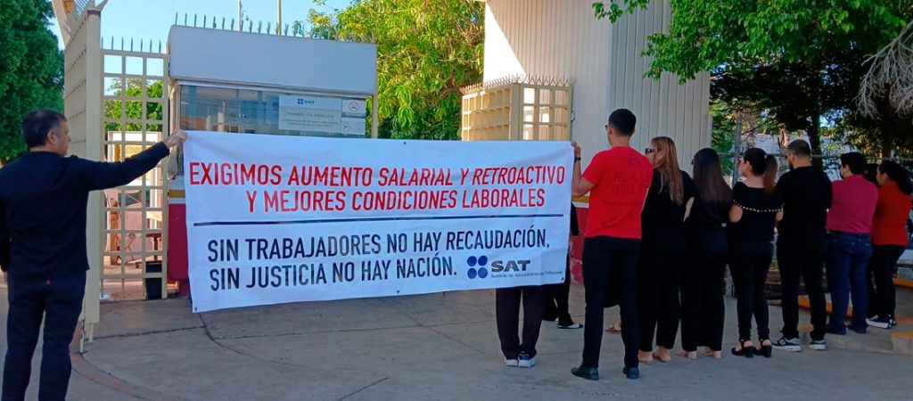 Cajeme 14 de Octubre 2025, Sonora.– Trabajadores del Sistema de Administración Tributaria (SAT) se manifestaron la mañana de este martes para exigir mejores condiciones laborales y un incremento salarial que se les había prometido desde hace meses.