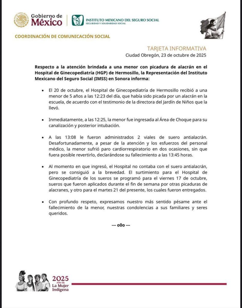 Hermosillo, Sonora. 23 de octubre de 2025. Una niña estudiante de preescolar falleció luego de ser picada por un alacrán y tras recibir atención médica en una clínica del IMSS que, en ese momento, no contaba con antídoto disponible para dicho tipo de envenenamiento.