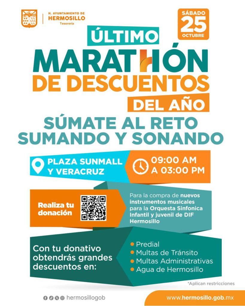 Hermosillo, Sonora; 24 de octubre de 2025.- El Gobierno Municipal de Hermosillo, a través de Tesorería, invita a las y los hermosillenses a aprovechar el último Maratón de Descuentos del año con el reto “Sumando y Sonando”, que se realizará este sábado 25 de octubre.