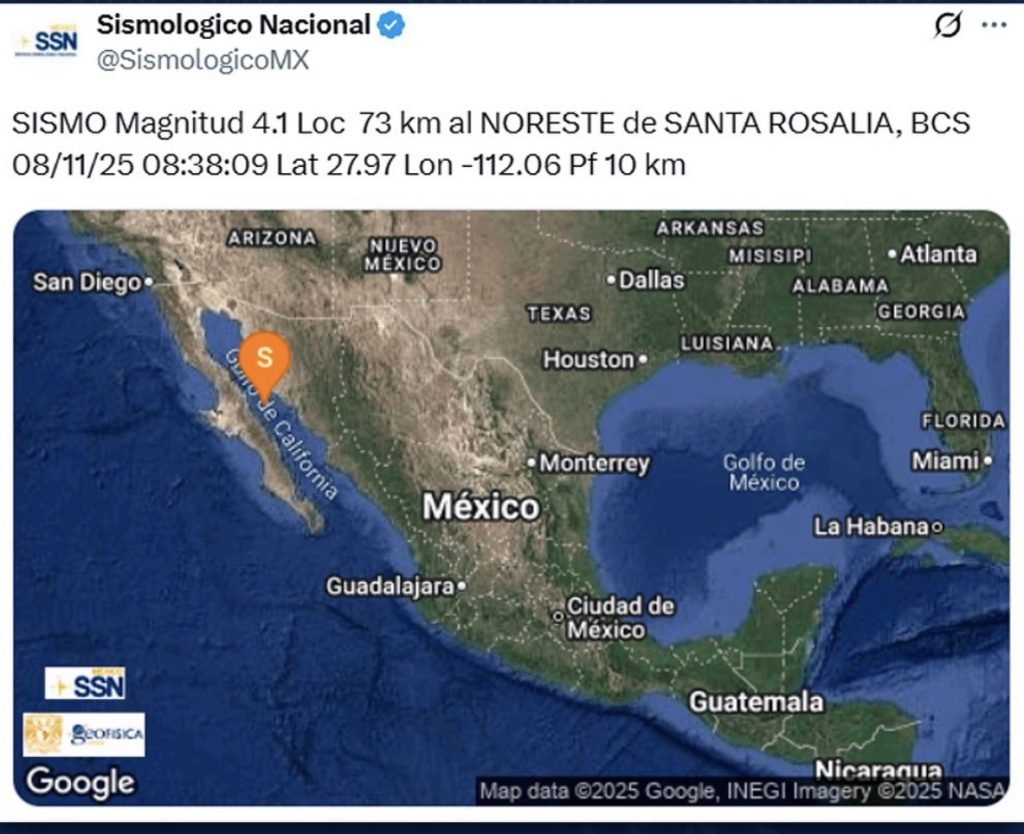 Un nuevo temblor se presentó la mañana de este sábado a 73 km de Santa Rosalía, Baja California Sur