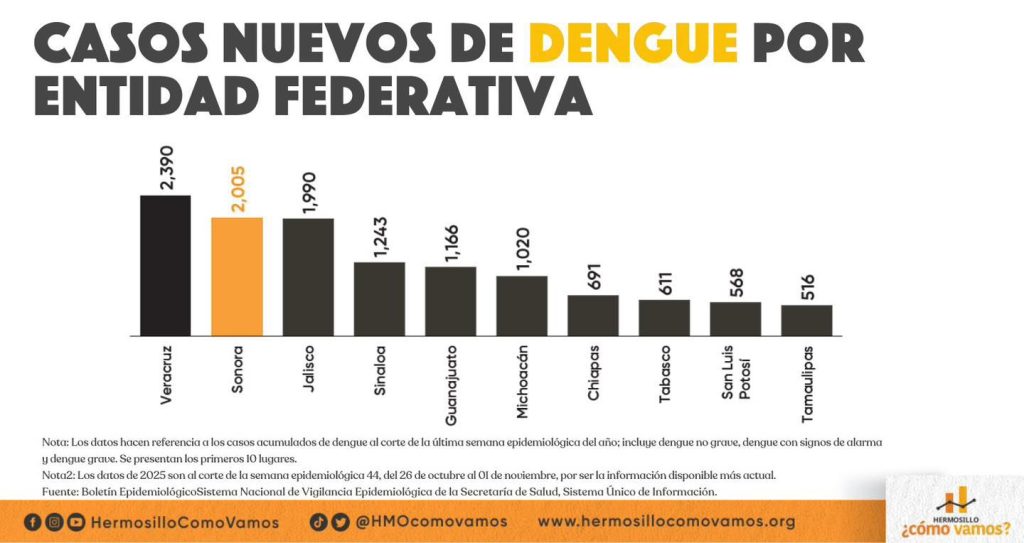 De acuerdo con el Sistema de Vigilancia Epidemiológica, el estado de Sonora ostenta el segundo lugar a nivel nacional en casos de dengue con un total de 2 mil 5 pacientes en el mes de octubre.