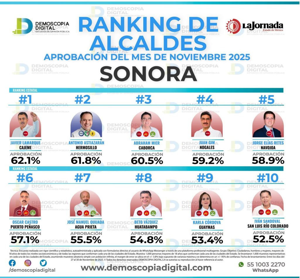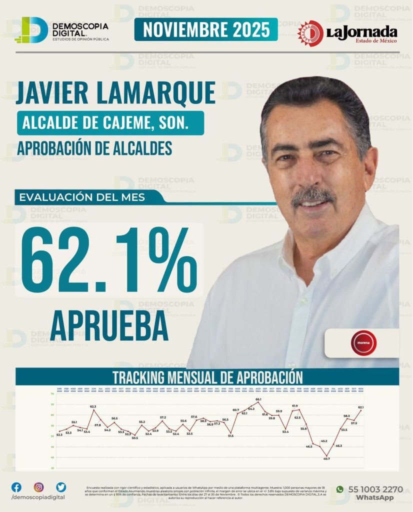 El sondeo —publicado en alianza con La Jornada Estado de México— ubica a Lamarque con una aprobación de 62.1%, posicionándose como el alcalde mejor evaluado de Sonora y manteniendo una tendencia estable en su tracking mensual.