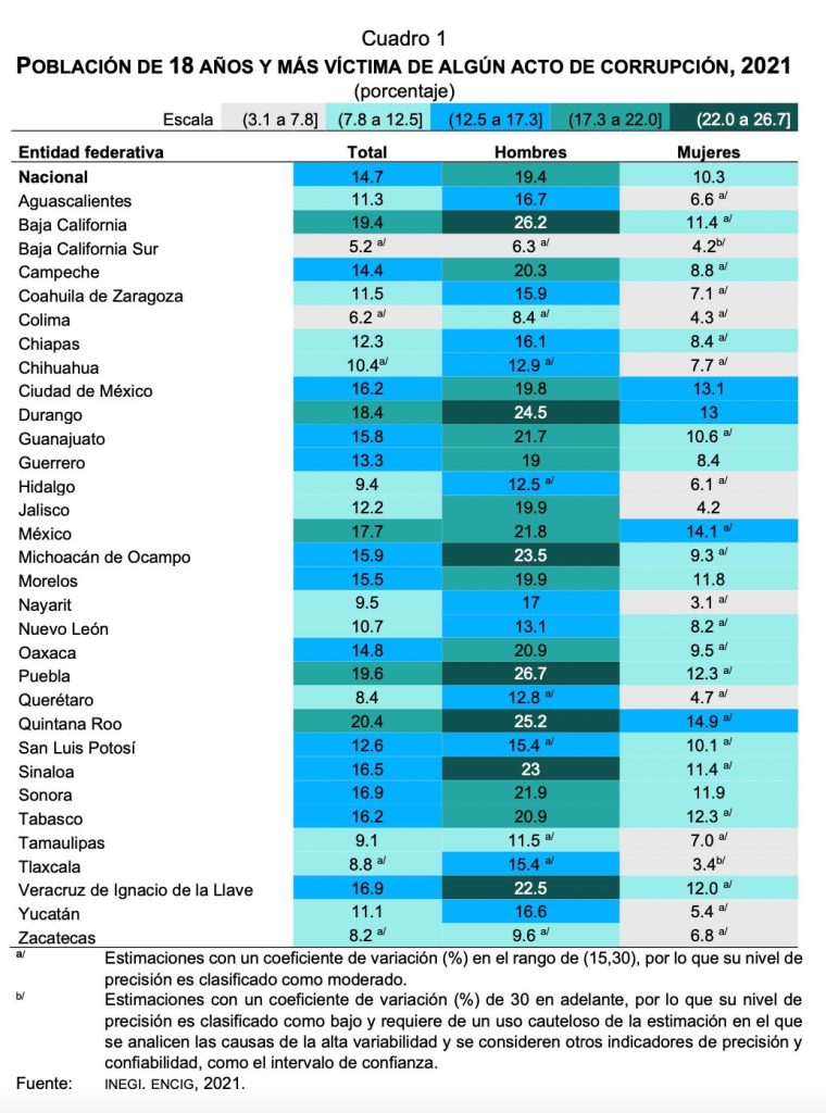 De acuerdo con las estadísticas, hasta un 16.9 por ciento de la población ha sido testigo de prácticas corruptas, llegando esto al 21.9 en el caso de los hombres y 11.9 en el caso de las mujeres.