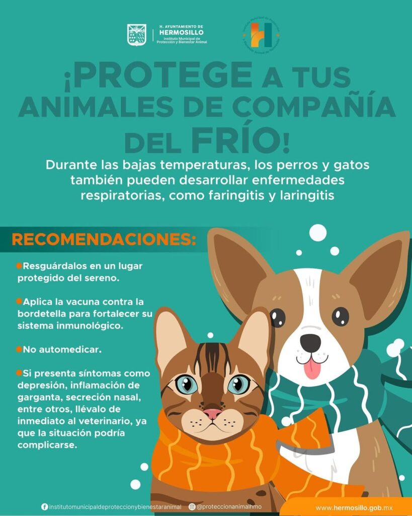 Hermosillo, Sonora, 31 de diciembre, 2025.- Un llamado a proteger a los animales de compañía durante la temporada invernal realizó el Instituto Municipal de Protección y Bienestar Animal, ya que pueden desarrollar enfermedades respiratorias.