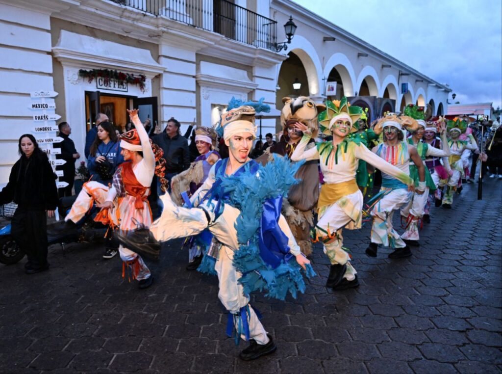 Las calles de Álamos se inundaron con las y los jóvenes de la Comparsa Sonora, conformada por estudiantes de la Universidad de Sonora, quienes, por encima de las inclemencias meteorológicas, recorrieron las viejas calles empedradas de la ciudad de los portales, contagiando a cada persona de su ritmo así como el asombro que generaron mostrando su indumentaria.