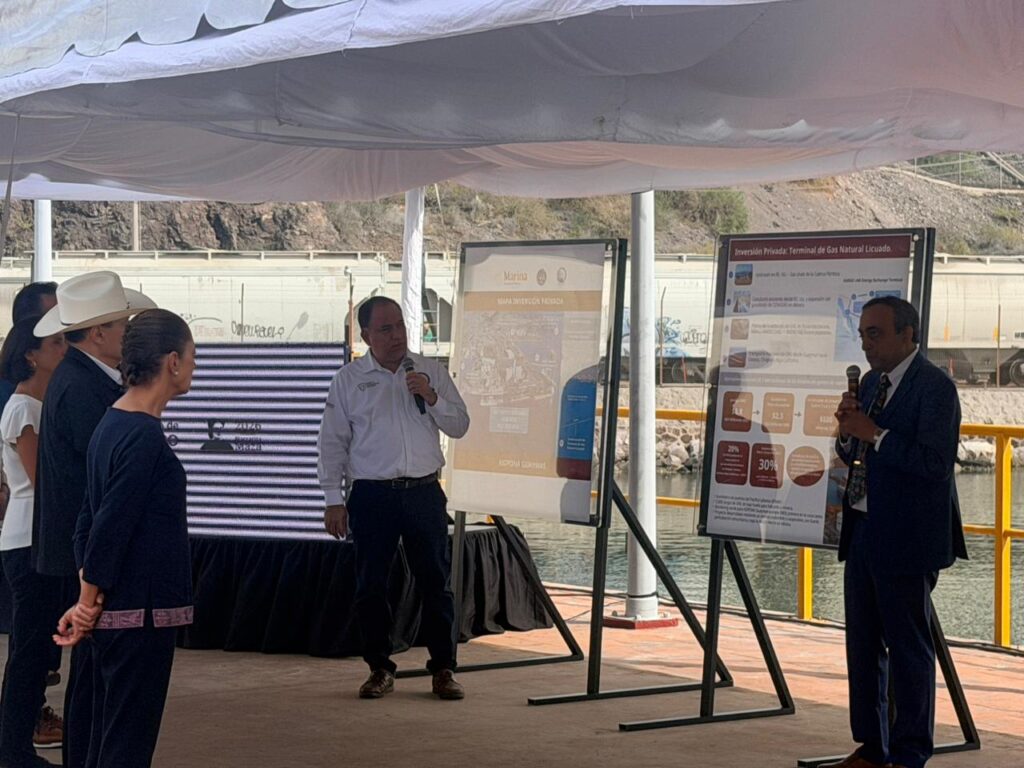 Durante el recorrido se presentaron los detalles del proyecto, que incluye la Terminal de Gas Natural Licuado (GNL), el Muelle 1 de Usos Múltiples, la modernización del Almacén de Concentrados y la planta desalinizadora, obras que permitirán ampliar de manera sustancial la capacidad operativa del puerto y consolidar a Guaymas como un nodo estratégico del comercio y la industria en el noroeste del país.