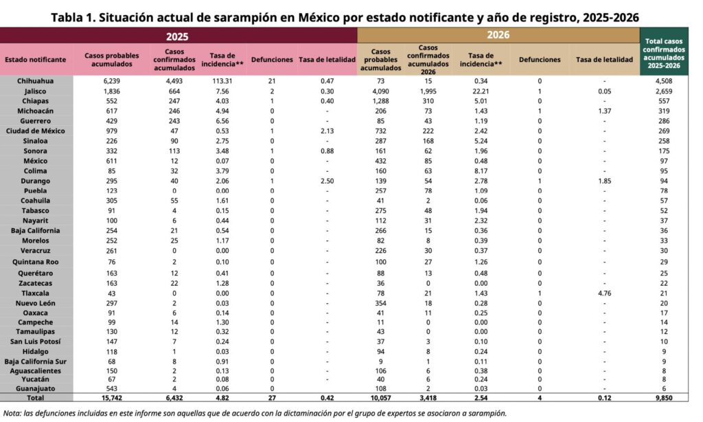 En cuanto a las defunciones registradas durante 2026, el balance nacional reporta únicamente cuatro muertes, una en cada una de las siguientes entidades: Jalisco, Michoacán, Durango y Tlaxcala. Las tasas de letalidad más altas corresponden a Tlaxcala y Durango, aunque con un número reducido de casos.