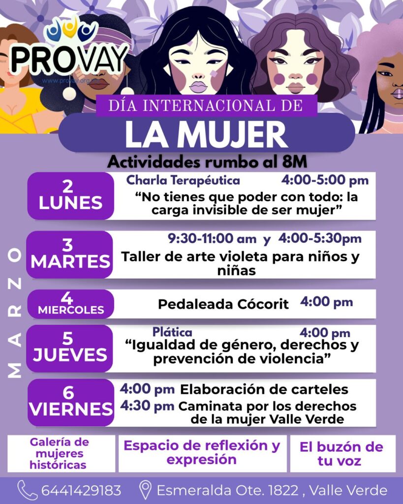 En el marco del Día Internacional de la Mujer, el Comité de Promoción del Valle del Yaqui (Provay) se encuentra realizando una serie de actividades encaminadas a conmemorar el Día Internacional de la Mujer, que se conmemora el 8 de marzo.