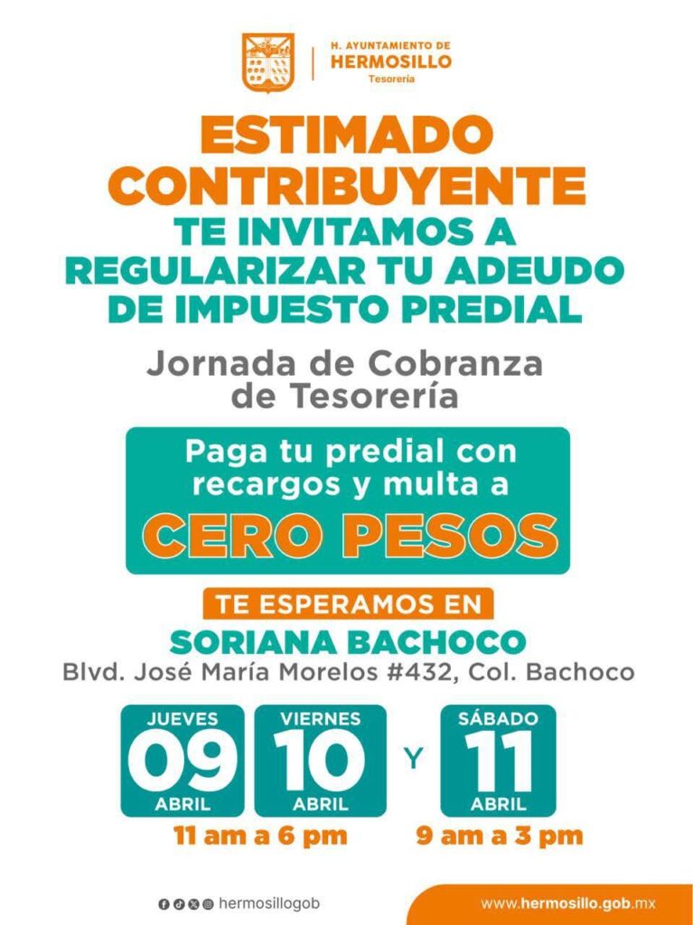 Hermosillo, Sonora; 8 de abril de 2026.- La Tesorería Municipal de Hermosillo realizará una jornada especial del Programa de Regularización de Predial en el centro comercial Soriana Bachoco, con el objetivo de facilitar a la ciudadanía el pago de este impuesto con beneficios como el 100% de descuento en recargos y multas.