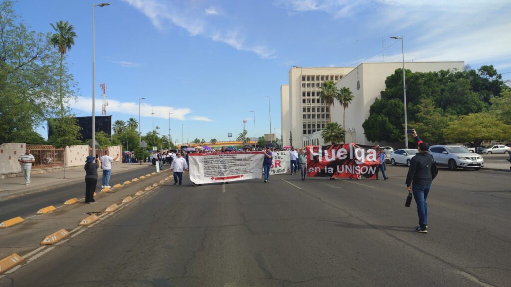 Desde las 9 de la mañana, integrantes tanto del sindicato de trabajadores académicos y de empleados, se concentraron en la rectoría de la UNISON para marchar en conjunto hasta Palacio de Gobierno, en exigencia de justicia laboral, así como el cumplimiento en el pago de sus prestaciones.