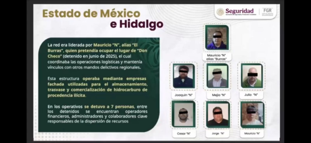 En los estados de Hidalgo y Estado de México se realizaron 20 cateos, que derivaron en la captura de Mauricio “N”, presunto líder del grupo, junto con otros seis integrantes, incluyendo operadores financieros y administrativos. También fueron detenidos dos empresarios vinculados al esquema delictivo.