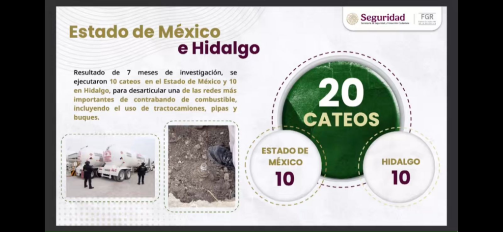 Los operativos se llevaron a cabo de manera simultánea en Hidalgo, Estado de México, Chihuahua y Ciudad de México, donde se logró identificar y desarticular a una organización dedicada al robo, transporte y venta ilegal de combustibles.